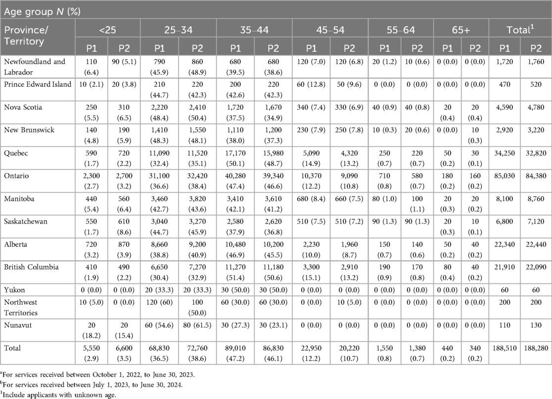 Information on the age grouping and place of residence of applicants appears in Table 4. The total number of applicants remained stable over the two periods, with 188,510 in P1 and 188,280 in P2 although P1 only consisted of 9 months while P2 was a 12-month span. Most approved applicants belonged to the 25–34 year old (36.5% P1 and 38.6% P2) and 35–44 year old (47.2% P1 and 46.1% P2) groups. This distribution was exhibited in all the provinces and territories. For example, in Ontario, 36.6% of parents in P1 were aged 25–34, increasing to 38.4% in P2, while those aged 35–44 accounted for 47.4% and 46.6%, respectively. In contrast, individuals <25 and those aged ≥65 made up a minimal portion of applicants. For instance, in Newfoundland and Labrador, those under 25 comprised 6.4% in P1 and 5.1% in P2, while those aged 65 and older represented less than 1% across most provinces.