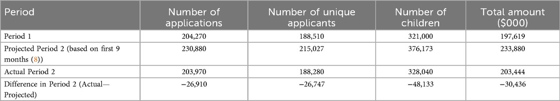 Lastly, based on published results of Interim CDB applications data for first three quarters of P2, the actual number of applications, number of unique applicants, number of children receiving the benefit and total amount dispersed for the Interim CDB during the entirety of P2 were compared to projected values based on the first 9 months of the program's second year (8).