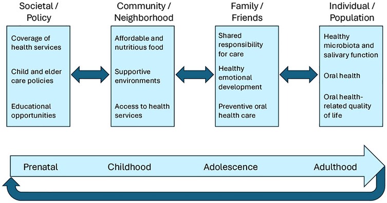 Inherent in the life course approach is the notion that people live in interdependence and determinants at various levels of situated networks of human relationships influence health and health care (13, 15). Figure 1 belongs to a class of social ecological models that are in widespread use (15–17) and which evolved from ongoing research and practice initiatives led by the authors. Specifically, this multi-level framework posits that factors at the societal/policy, community/neighborhood, and family/friends levels influence health outcomes including healthy microbiota and salivary function, oral health, and oral health-related quality of life at the individual/population level.