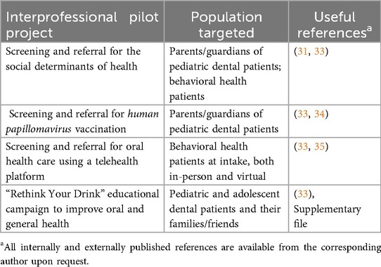 Table 1. Interprofessional pilot projects conducted at Family Health Centers at NYU Langone in Brooklyn, New York, USA to improve oral health across the life course and useful references.