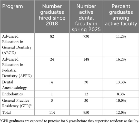 Table 2. Graduates of the 5 NYU Langone dental medicine postdoctoral residency programs hired since 2018 among active dental faculty in spring 2025, by program and overall.