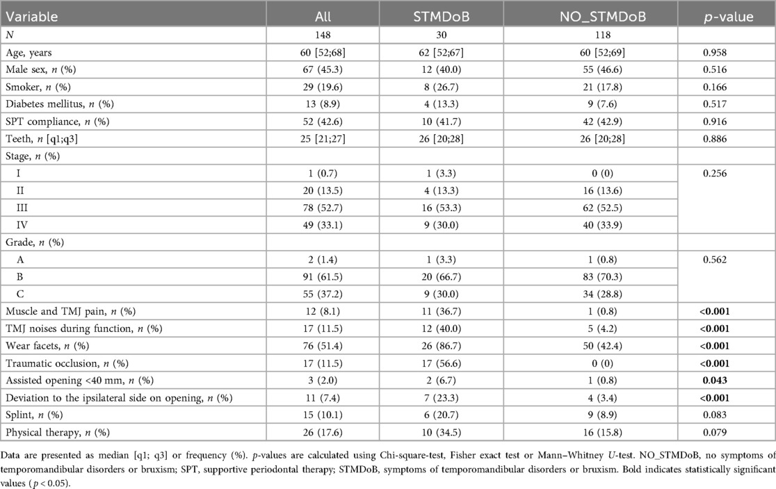 Seven hundred fifty-nine patients received steps I and II of periodontal therapy between February 2011 and March 2016. The final analysis included 148 patients who met the inclusion criteria described above (Figure 1). This study cohort presented with a median number of 25 [21;27] teeth at a median age of 60 [52;68] years at baseline, the male-to-female ratio was 54.7/45.3%, 19.6% of the patients were current smokers at baseline, and 8.9% were diagnosed with diabetes mellitus (Table 1). Of the total of 148 subjects evaluated; 1 (0.7%) exhibited stage I, 20 (13.5%) stage II, 78 (52.7%) stage III and 49 (33.1%) stage IV periodontitis. Concerning the periodontal grade, 2 participants (1.4%) were classified as grade A, 91 (61.5%) as grade B, and 55 (37.2%) as grade C. 118 participants showed NO_STMDoB, while 30 reported on STMDoB (Table 1). In the STMDoB group, 11 participants (36.7%) reported signs of myalgia, 12 (40%) noises from the temporomandibular joint, 26 (86.7%) wear facets, 17 (56.6%) traumatic occlusion, 2 (6.7%) limitations on mouth opening, and 7 (23.3) a deviation to the ipsilateral side upon opening (Table 1). Of the patients in the STMDoB group, 6 (20.7%) had a bite splint and 10 (34.5%) received physiotherapy specially adapted to TMD (Table 1).
