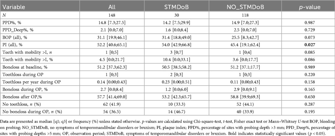 Materials and methods: 148 patients diagnosed with periodontitis received individual department specific screening for symptoms of TMD or bruxism prior to initial treatment and were stratified into patients with symptoms related to TMD or bruxism (STMDoB = 30) and without symptoms (NO_STMDoB = 118). Progression of periodontitis was determined by tooth loss (TL) as well as radiographic bone loss (RBL), using longitudinal radiographic data with a follow-up of at least 5 years.