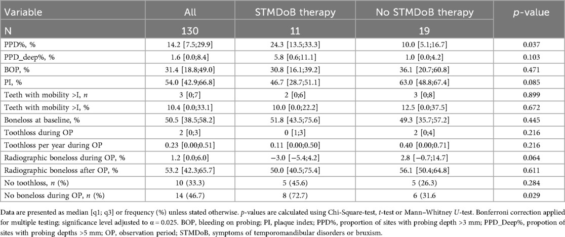 As described in detail before (22), all examinations were conducted prior to the first two steps of periodontal therapy (T0) by two calibrated periodontists (CE and RH) (24). PPD were measured using the PCP-12 probe in whole mm at 6 points per tooth and checked for BOP after 30 s (25). Tooth mobility was documented using the classification of mobility as described by Miller et al. (26), and transferred to a patient-related variable by indicating the proportion of teeth with mobility >class 1 out of the total dentition as well as their number. Periodontal pockets were defined as sites with PPD >3 mm, and deep periodontal pockets as PPD ≥6 mm. Proportions of all periodontal pockets and deep periodontal pockets were included as variables on the patient level, calculated as % of sites with corresponding pockets. Regular SPC was assumed if the patient attended at least once a year. All patients received a standardized department specific screening for TMD or bruxism using an individual protocol focusing on physical signs and symptoms. In brief, the following parameters were examined: (1) muscle or facial pain upon opening or closing, (2) noise of the temporomandibular joint during function (i.e., creaking or clicking), (3) wear facets of the teeth, (4) traumatic occlusion, (5) limited mouth opening <40 mm, (6) deviation upon opening. If more than two of these symptoms were detected, the patient was classified as STMDoB herein (27). Treatment of TMD and bruxism included systemic medication such as NSARs, various types of splints as standard, and physiotherapy. Patients were radiographically re-evaluated once, at a mean follow-up of 72 months. No interim follow-up visits were conducted. No further assessment of STMDoB was performed during the observation period. As outcome parameter periodontal progression was determined by tooth loss (TL) as well as radiographic bone loss (RBL) were defined using longitudinal radiographic data over at least 5 years.
