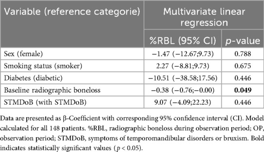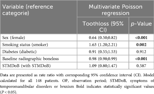This study has several of limitations that might reduce its generalisability, applicability and transferability. Due to the monocentric observational setting, overall generalisability is limited. Further, the current study may have suffered from incomplete data collection, especially regarding periodontal charts on follow-ups. All steps of therapy were performed in the undergraduate program under the supervision of experienced periodontists. While this setup presents a limitation regarding the comparability of the data, it offers a realistic picture of daily dental practice (22, 42). Participants were only re-evaluated once radiographically at a mean follow-up of 72 months. No interim assessments of STMDoB or related treatments were conducted. Therefore, changes in symptom status or treatment effects during the follow-up period could not be captured and evaluated. A further limitation of the study is that the patients were undergoing non-surgical periodontal therapy only. Consequently, it is unlikely that stage III and IV patients could achieve stable therapy endpoints; however, they may stabilise and demonstrate an acceptable outcome (43). Additionally, it should be noted that the diagnostic chart of the DC/TMD was not entirely employed, but rather, an individual protocol focusing on the typical TMD or bruxism related symptoms was utilized which limits the comparability. This is not an uncommon practice, as modifications of the DC/TMD are frequently used as a preliminary screening tool before initiating a potential therapeutic intervention (27, 32–34). Although the overall model showed strong explanatory power, the post hoc power for the primary predictor (STMDoB), based on its partial and univariable R², was low (approximately 16%). This indicates that the effect of STMDoB alone may be modest, and the study may have been underpowered to detect it. While STMDoB was not statistically significant in this context, the result should be interpreted with caution and warrants validation in larger or prospective studies. Furthermore, the diagnosis of sleep bruxism was not further differentiated leading to a limited interpretation of occlusal trauma overnight.