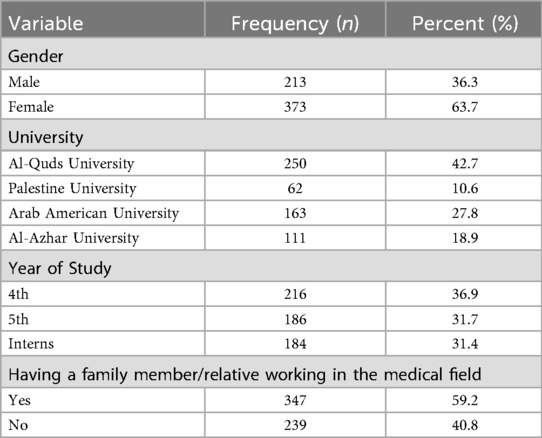 A total of 586 Palestinian dental students participated in the online questionnaire, achieving a response rate of 38%. The majority of respondents were female, representing 63.7% (n = 373) of the sample. Regarding academic year distribution, 36.9% were in their 4th year (n = 216), 31.7% in their 5th year (n = 186), and 31.2% in their internship year (n = 184). Additional sociodemographic characteristics are presented in Table 1.