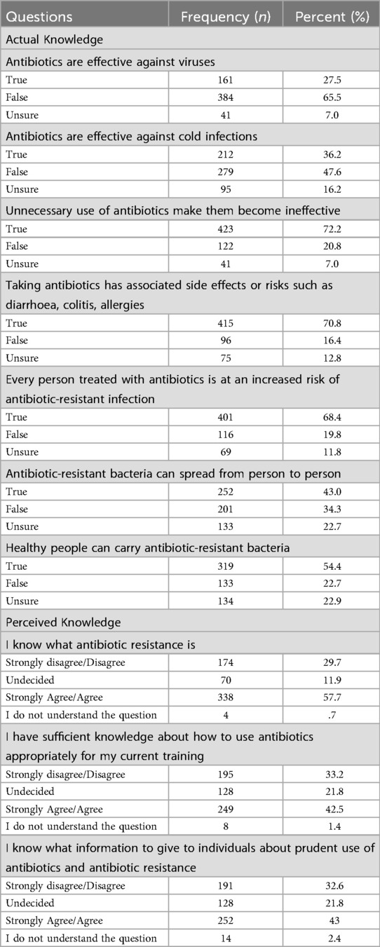 In terms of perceived knowledge, 57.7% (n = 338) of students agreed or strongly agreed that they understood the concept of antibiotic resistance. The distribution of responses was significantly skewed toward agreement (χ2 = 271.3, p < 0.001), reflecting non-random clustering around higher self-perceived knowledge.