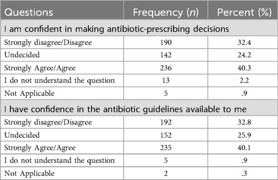 The Confidence Scale comprised two items: “I am confident in making antibiotic prescribing decisions” and “I have confidence in the antibiotic guidelines available to me”, with a total score range of 8, a minimum score of 2, and a maximum score of 10 Cronbach's Alpha of confidence composite scale was 0.874.