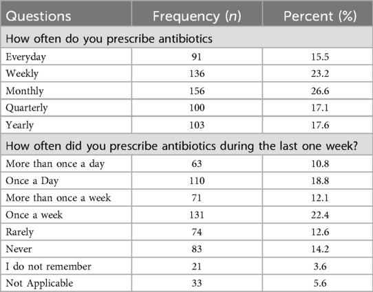 An analysis of the respondents' antibiotic prescription patterns revealed that a significant proportion prescribed antibiotics regularly: 15.5% reported prescribing them daily, 23.2% weekly, and 26.6% monthly. When asked specifically about their prescribing practices in the past week, 18.8% indicated they had prescribed antibiotics once a day, while 22.4% reported doing so once a week.