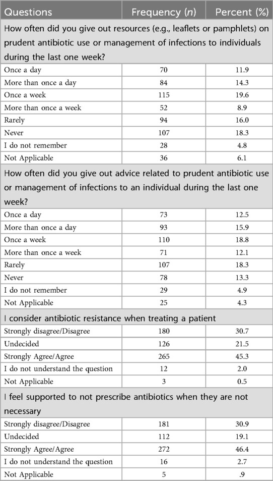 Our findings highlighted several practices related to prescribing antibiotics to patients. Among the respondents, 19.6% reported providing resources (e.g., leaflets or pamphlets) on prudent antibiotic use or infection management to individuals once a week, while 18.3% indicated they never distributed such materials. Regarding offering advice on prudent antibiotic use or infection management, 12.5% provided advice once a day, and 18.8% did so once a week.