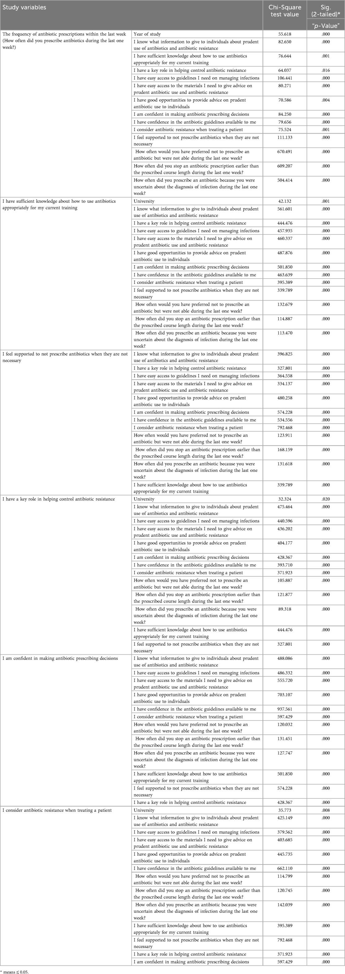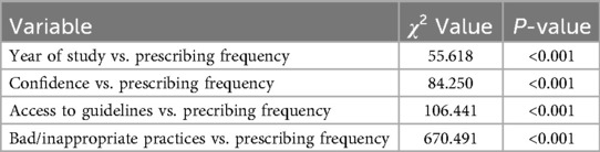 Knowledge-related variables showed significant negative associations with prescribing frequency. Statements such as “I know what information to give to individuals about prudent use of antibiotics and antibiotic resistance” (χ2 = 82.650, p = .000), “I have sufficient knowledge about how to use antibiotics appropriately for my current training” (χ2 = 76.644, p = .001), and “I am confident in making antibiotic prescribing decisions” (χ2 = 84.250, p = .000) revealed that increased knowledge and confidence correlated with reduced prescribing frequency.