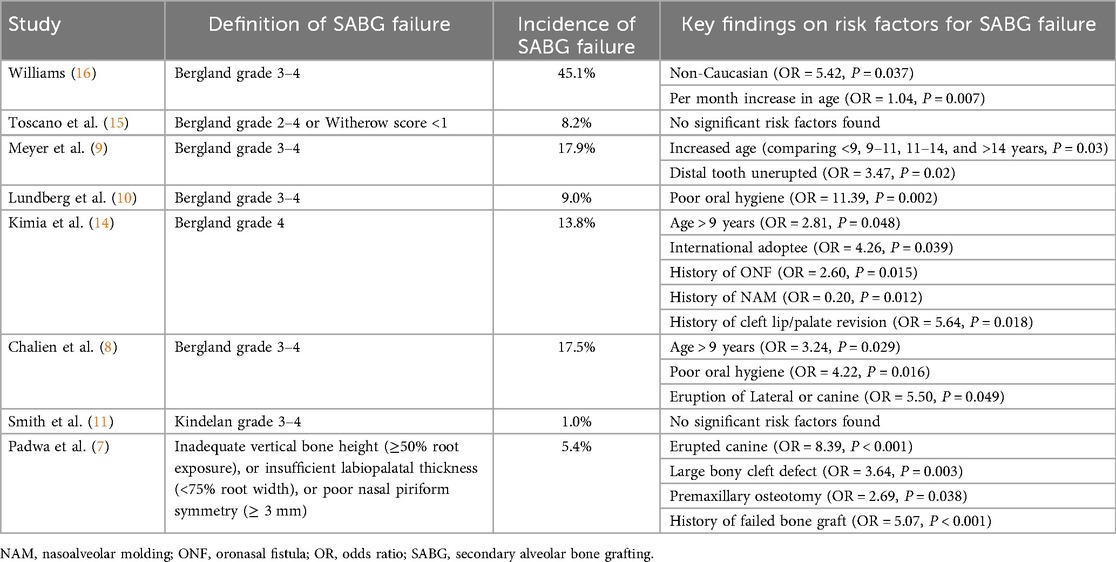 The key finding of this systematic review was that the definition and prevalence of SABG failure varied across studies. The primary risk factors identified included increased age at SABG, poor oral hygiene, and the presence of an erupted lateral or canine tooth. Additionally, non-Caucasian ethnicity, international adoption, large cleft size, a history of cleft lip/palate revision or ONF, NAM, and premaxillary osteotomy were also found to be associated with a higher risk of SABG failure.