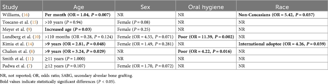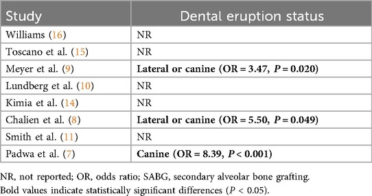 A total of three studies (7–9) identified the dental eruption status as a risk factor for SABG failure. Among them, two studies (8, 9) reported that an erupted lateral or canine tooth at the time of SABG significantly increased the risk of failure, with ORs of 3.47 and 5.50, respectively. Another study (7) found that an erupted canine tooth (OR = 8.39) was significantly associated with SABG failure (Table 5).