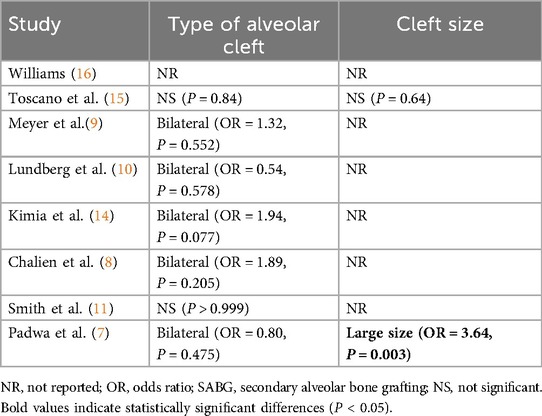 Type of alveolar cleft. A total of seven studies investigated the association between the type of alveolar cleft and SABG failure. However, none of the individual studies found a significant association (Table 6).