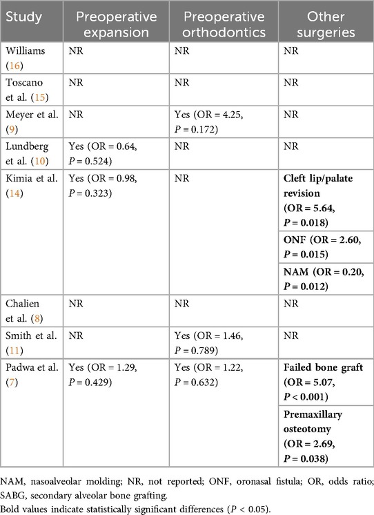 Other surgeries. Two studies (7, 14) found that there was a significant association between cleft lip/palate revision (OR = 5.64) or failed bone graft (OR = 5.07) and SABG failure. Additionally, it was found that a history of oronasal fistula (ONF) (OR = 2.60) and premaxillary osteotomy (OR = 2.69) was associated with higher odds of SABG failure. In contrast, a history of nasoalveolar molding (NAM) was significantly associated with a lower risk of SABG failure (OR = 0.20) (Table 7).