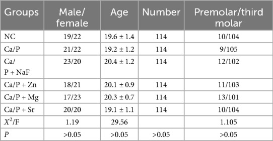 The surfaces of all collected teeth were cleaned using an ultrasonic scaler. All teeth were then subjected to uniform high-temperature and high-pressure sterilization, followed by drying for subsequent use. Teeth were randomly numbered and divided into 6 groups using the random number table method, with allocation performed in a blinded manner. Each group contained an equal number of teeth, and samples were further numbered twice. Zinc chloride, sodium fluoride, magnesium chloride, and strontium chloride were dissolved in the mineralization solution at 37°C to prepare saturated solutions. When these substances were added to pure water, they exhibited either endothermic or exothermic behavior. The solution was deemed to have reached a saturated concentration when its temperature stabilized at 37°C and crystal precipitation was observed. The concentrations of the respective saturated solutions were as follows: sodium fluoride, strontium chloride, magnesium chloride, and zinc chloride at approximately 3.9 wt/vol %, 80.8 wt/vol %, 40.5 wt/vol %, and 162.2 wt/vol %, respectively. The saturated solutions were filtered through a 0.22 μm filter. The experimental groups were as follows: NC group (pure water), Ca/P group (mineralization solution), Ca/P + NaF group (Ca/P + NaF saturated solution), Ca/P + Zn group (Ca/P + Zn saturated solution), Ca/P + Mg group (Ca/P + Mg saturated solution), and Ca/P + Sr group (Ca/P + Sr saturated solution). Teeth were immersed in the designated solutions at 37°C for 24 h, then removed, dried, and stored. All the above operations were conducted in a clean bench. All subsequent experiments used these processed samples. Based on the second numbering, teeth were again randomly assigned to experiments using the random number table and blinded allocation (Table 2). RT-PCR, pH measurements, and bacterial proliferation assays were performed using bacterial culture medium, with all teeth assigned a recorded number of 0. No tooth was reused.