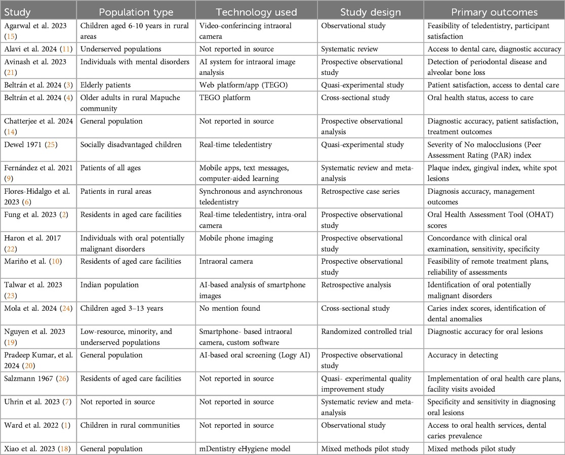 The 21 studies represented a broad spectrum of populations and settings, highlighting the versatility of digital dental technologies. Study samples included children (5 studies), older adults (5 studies), rural residents (4 studies), underserved or disenfranchised groups (4 studies), and general populations (3 studies). Technologies encompassed AI-enabled diagnostic systems, intraoral cameras, mobile imaging devices, real-time teleconsultation platforms, and purpose-built software; however 6 studies did not explicitly describe the technology used. Study designs comprised observational studies (6 studies), quasi-experimental studies (4 studies), systematic reviews, cross-sectional studies, and one randomized controlled trial. The most frequent reported primary outcomes were diagnostic accuracy, access to care, satisfaction, feasibility, and treatment effectiveness.
