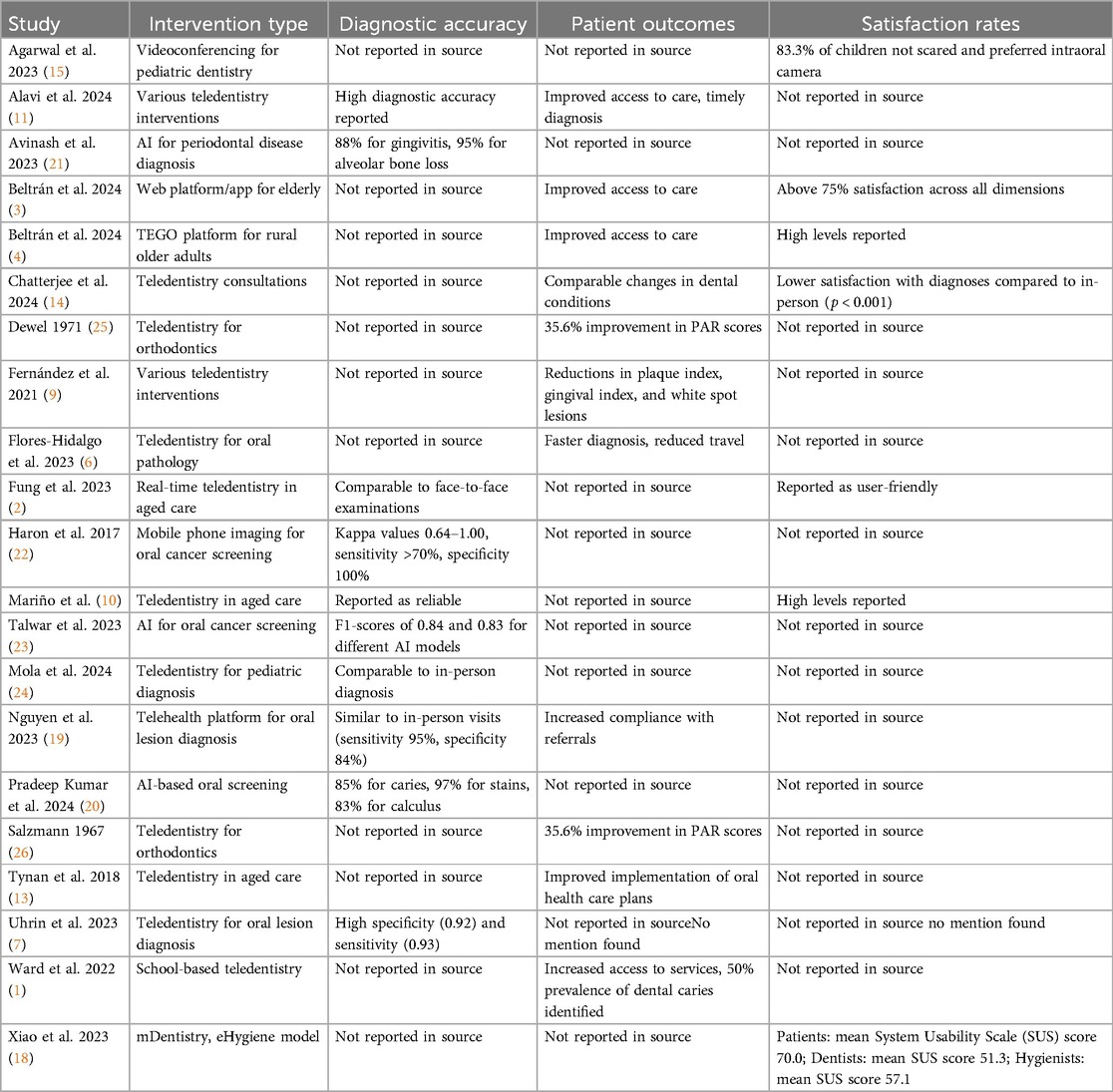 14. Chatterjee S, Lakshmi KG, Khan AM, Moothedath M, Reshma VJ, Mir FM, et al. Evaluating the impact of teledentistry on patient outcomes, diagnostic accuracy, and satisfaction in a prospective observational analysis. Cureus. (2024) 26(2):e54424. doi: 10.7759/cureus.54424