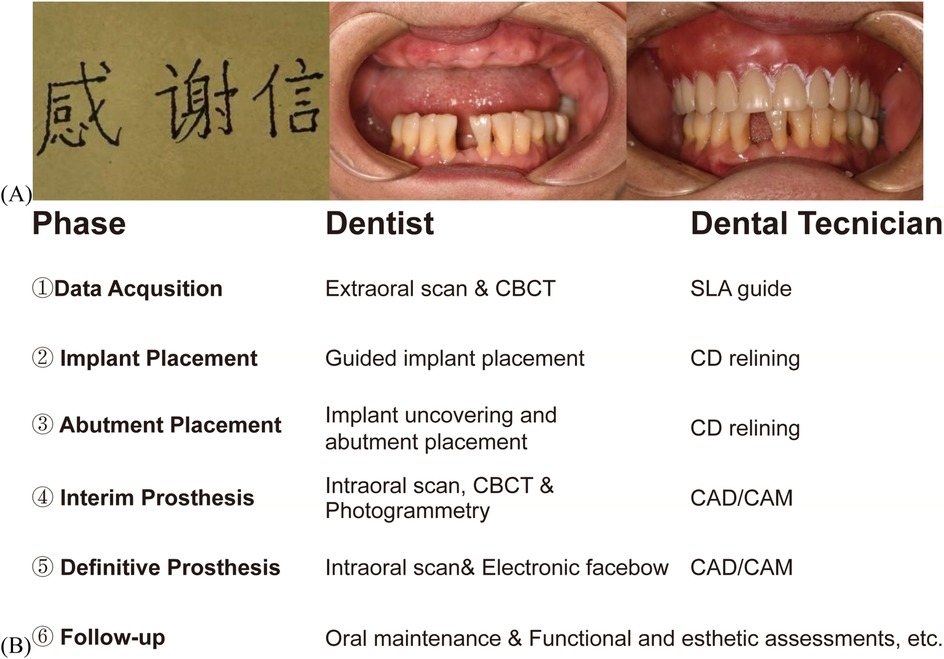 Figure 1. Cinical photographs and digital treatment plan of patient. (A) Patient's handwriting and intraoral images, including one with a CD. (B) Digital workflow for maxillary all-on-six prostheses in tremor patients: clinician-technician synergy.