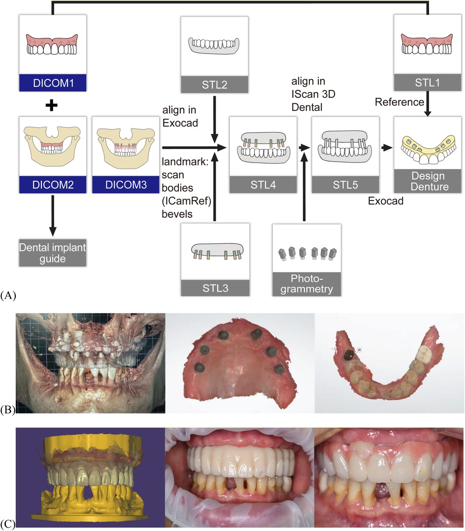 Figure 2. Digital workflow for maxillomandibular relationship transfer and prosthetic design. (A) Schematic illustration of digital workflow for maxillomandibular relationship transfer and prosthetic design. Maxillary CD CBCT scan—data as DICOM1, maxillary CD scan—data as STL1, patient wearing maxillary CD in centric occlusion during CBCT scan—data as DICOM2, DICOM1 and DICOM2 were imported into 3Shape Implant Studio™ for surgical guide design. The maxillary CD was relined at the implant healing cap sites and another CBCT was performed with the CD in centric occlusion—data as DICOM3, mandibular intraoral scan—data as STL2; maxillary intraoral scan with healing caps—data as STL3, STL2 and STL3 were aligned using DICOM3 to generate STL4, ICAM 4D photogrammetry was used to capture the maxillary implant positions, which were merged with STL4 to create STL5, the interim prosthesis was designed on STL5, with tooth arrangement referenced from STL1. (B) Postoperative CBCT, intraoral scan of the maxilla and mandible. (C) Digital design of the prosthesis, intraoral view of temporary resin prosthesis and interim prosthesis.