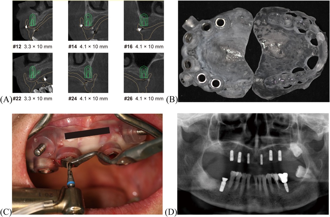 Eight concave depressions were prepared on the tissue surface of the existing CD. These depressions were packed with gutta-percha to create a radiographic guide. A CBCT (I-Cat, Imaging Sciences International, Pennsylvania, USA) scan was first acquired of the radiographic guide alone (Figure 2A DICOM1). The guide was then seated intraorally in centric occlusion, and a second CBCT scan was obtained (Figure 2A DICOM2). Both CBCT datasets were imported into 3Shape Implant Studio™ software. Prosthetically driven planning for maxillary implant placement (Figure 3A) and surgical guide design was performed, resulting in a surgical guide that preserved the existing occlusal relationship. The prosthetically driven implant surgical stackable guides with occlusal registration were printed (Figure 3B and Supplementary Figure S1) (22). In clinical use, the double-layer guide is placed intraorally and the patient bites in centric occlusion (Supplementary Figure S1). After fixing the surgical guide with fixation pins, the occlusal guide is removed, exposing the designed implant guide holes for precise implant placement. Despite challenges posed by involuntary tremors and limited interocclusal space in the patient, the digitally guided protocol ensured precise positioning of the implants within 40 min, performed under local infiltration anesthesia. The implants used were ITI RC BL with SLA surface treatment. Implant sites included #12 and #22 [3.3 × 10 mm], #14, #24, #16, and #26 [4.1 × 10 mm], and tooth #46 was concurrently implanted [4.8 × 10 mm] (Figure 3C and Figure 3D). Primary stability was achieved at the time of placement, with insertion torque values between 10 and 15 N · cm. A submerged (two-stage) healing protocol was chosen to optimize osseointegration, considering the patient's advanced age and female gender. At the four-month follow-up, the Implant Stability Quotient (ISQ) was measured (Supplementary Table S1) and transmucosal healing caps and multiunit abutments were used. The original CD was relined and adjusted to support occlusal function during implant osseointegration.