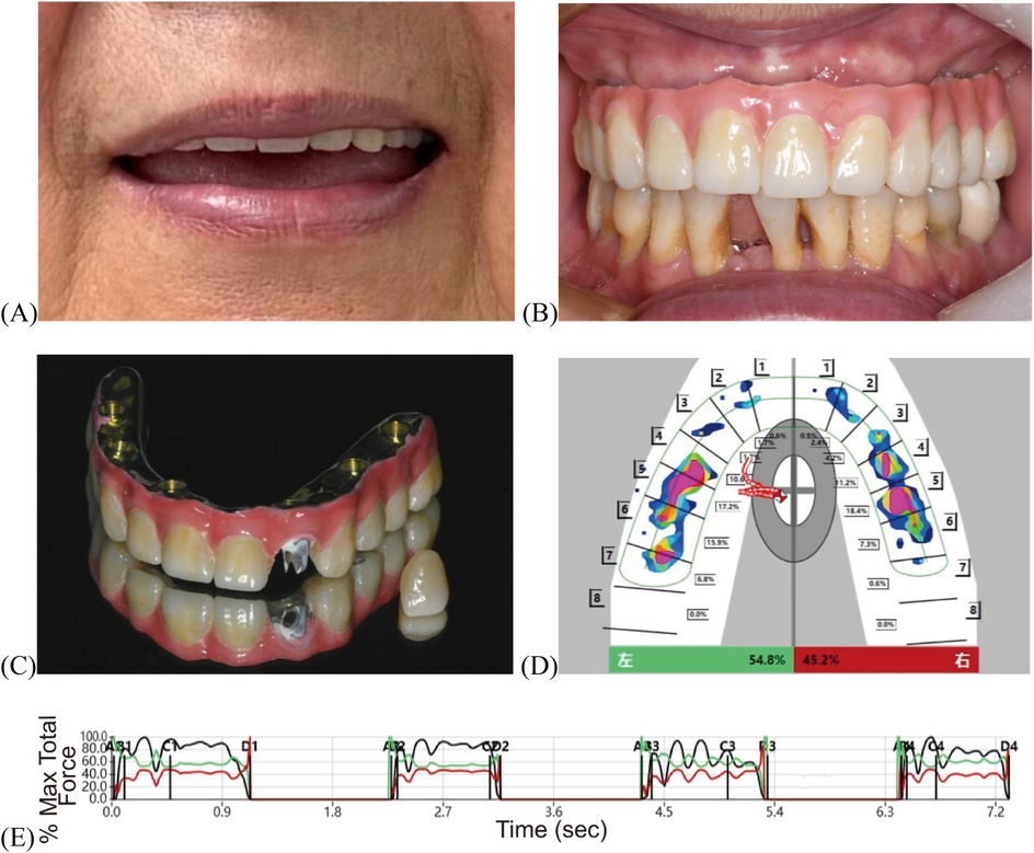 Following a three-month adaptation period for maxillomandibular relation and occlusion using the interim prosthesis, intraoral scans of the prosthesis in situ, the mucosa (after prosthesis removal), the opposing arch, and the occlusal registration were acquired. This scan data was then merged with the previously obtained ICAM 4D dataset. During the process, occlusal wear patterns from the interim prosthesis were integrated via Boolean operations to refine the occlusal scheme.The definitive prosthesis was fabricated using CAD/CAM technology. It consisted of an anodized titanium framework supporting monolithic zirconia crowns (Lava Ultimate, 3M ESPE, USA) with the gingival portion fabricated in multi-shade light-curing composite resin material (Shofu Dental, Japan) (Figures 4A,B). The passivity of the titanium framework was verified intraorally by the chief clinician using “alternate finger pressure” method and probe testing to ensure a passive fit (23). The metal framework was treated by sandblasting and gold plating to enhance bonding strength, and then the crowns were cemented using 3M™ RelyX™ U200 adhesive. To address the labial screw access at site #22, a retrievable single crown was designed without compromising aesthetics (Figure 4C). At the one-year postoperative follow-up, T-Scan analysis demonstrated occlusion time <0.2 s and midline-aligned center of force, confirming clinically occlusal stability (Figures 4D,E; Supplementary Tables S2, S3) (24). Post-treatment OHIP-EDENT scores showed a significant reduction, from 57 to 22 in the total score (Supplementary Table S4), with only mild residual speech adaptation issues (19, 20). The patient reported greater ease in daily oral hygiene maintenance and noted that cleaning the prosthesis became simpler and more efficient. She also described feeling more confident when chewing, with improved masticatory strength and no discomfort during meals. Overall, she expressed high satisfaction with the final prosthesis and described it as comfortable and stable in daily activities.