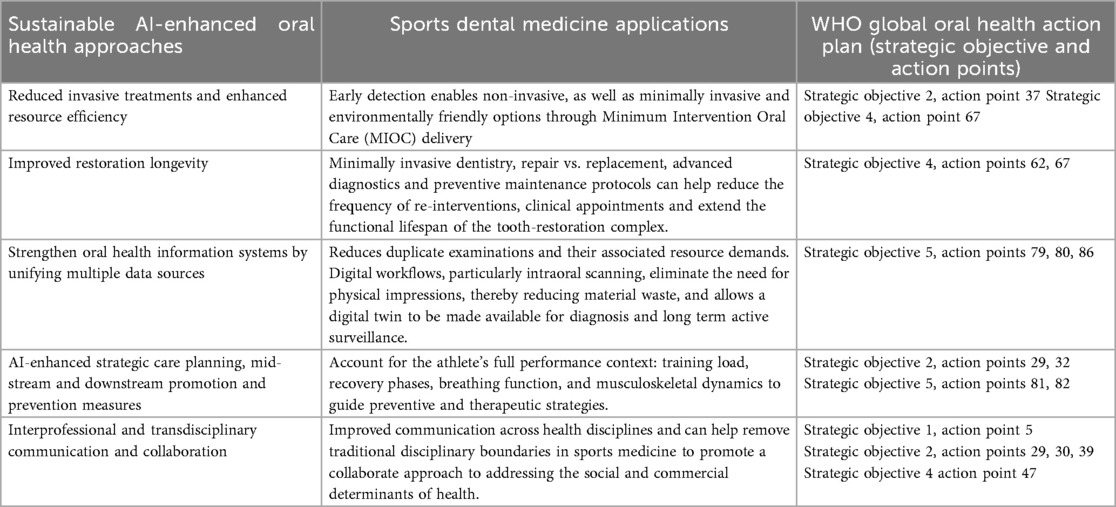 Table 1. Alignment of sustainable AI-enhanced oral health approaches with sports dental medicine and the WHO global oral health action plan.