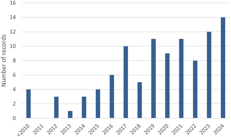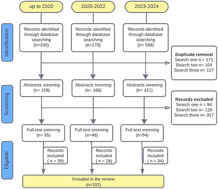 A total of n = 1,198 records were retrieved from literature searches conducted at three time points as described in Figure 1. Out of these, n = 402 duplicates were removed and a total of n = 205 full-text articles were screened from which n = 101 articles were included. The main reasons for excluding manuscripts following full text screening were: (1) OHQoL was not assessed with many study only assessing health related quality of life, (2) The studies were not relevant to the topic, for example not related to head and neck cancer, (3) Publications that did not provide data such as protocol studies, conference abstracts and reviews. The 101 selected studies were published between 2001 and 2024, and a year-wise breakdown of publications is presented in Figure 2. Data extracted from each included article are presented in (Supplementary Tables S2, S3).