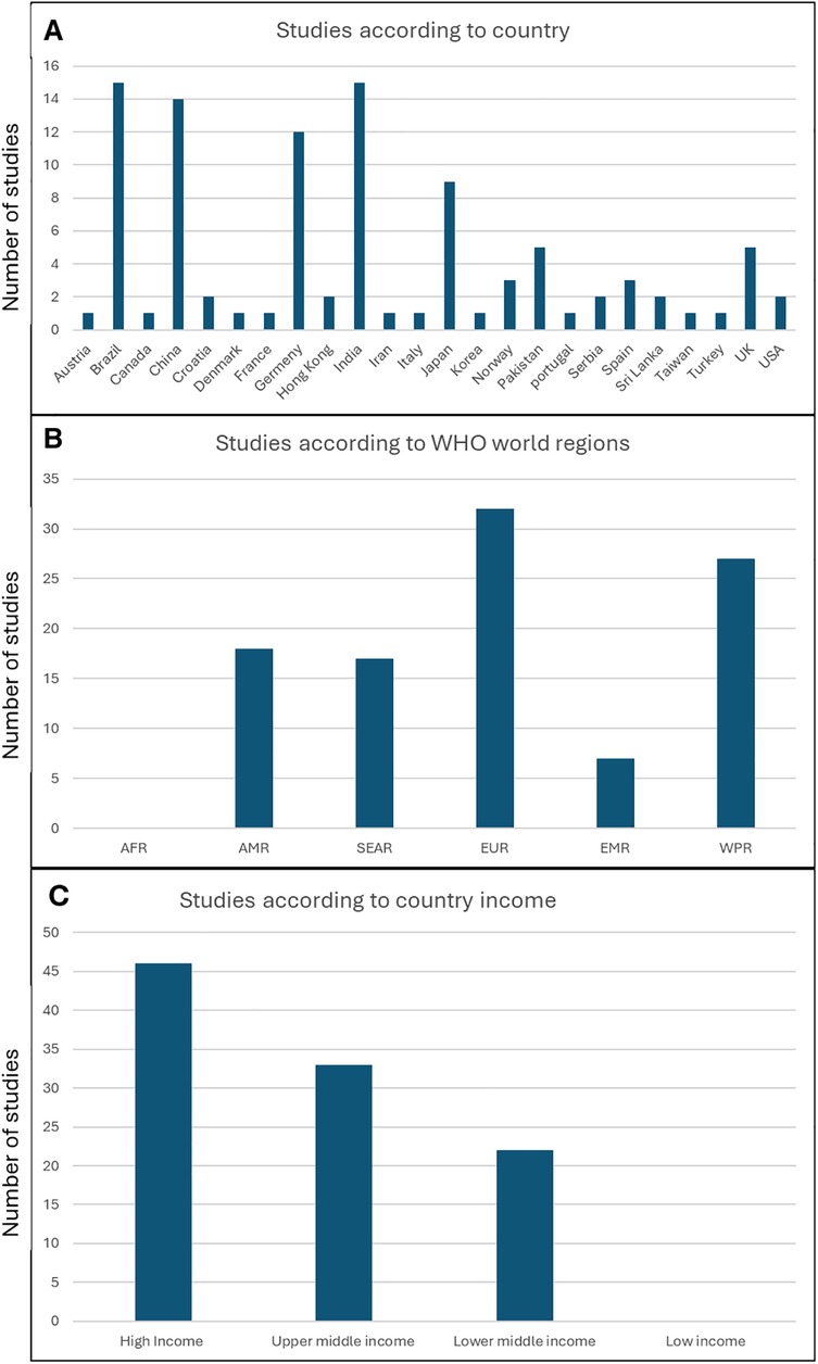 Figure 3. Geographical distribution of the studies (A) number of studies per country (B) number of studies per wHO world regions (C) number of studies according to country income classification. AFR, African region; AMR, region of the Americas; SEAR, South-East Asian region; EUR, European region; EMR, Easter Mediterranean region; WPR, Western Pacific region.