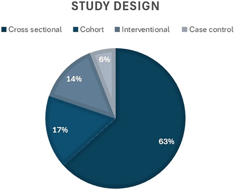 Regarding the study design, the majority of the studies (n = 64, 63.4%) were cross-sectional, while 17% (n = 17) were cohort, 14% (n = 14) used interventional designs, and 6% (n = 6) were case control (Figure 4). Thirteen questionnaire tools were used to assess OHQoL, with some studies reporting more than one tool. The frequency and percentage of studies using each tool is presented in Table 1.