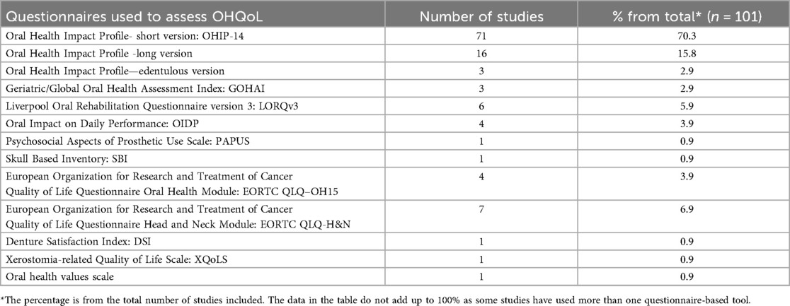 More than two thirds of the studies used oral health impact profile short version (OHIP-14), for OHQoL assessment. This commonly used tool is simple and can be completed in less than 10 min and has been translated and validated in many languages including Tamil, Hindi, Sinhala, Spanish, Serbian, German, Japanese, Chinese, and Urdu demonstrating a good cross-cultural adaptability. The participants rate their problems on a five-point Likert scale coded as never (score 0), hardly ever (1), occasionally (2), fairly often (3) and very often (4). A higher score in OHIP tool indicates poor OHQoL.