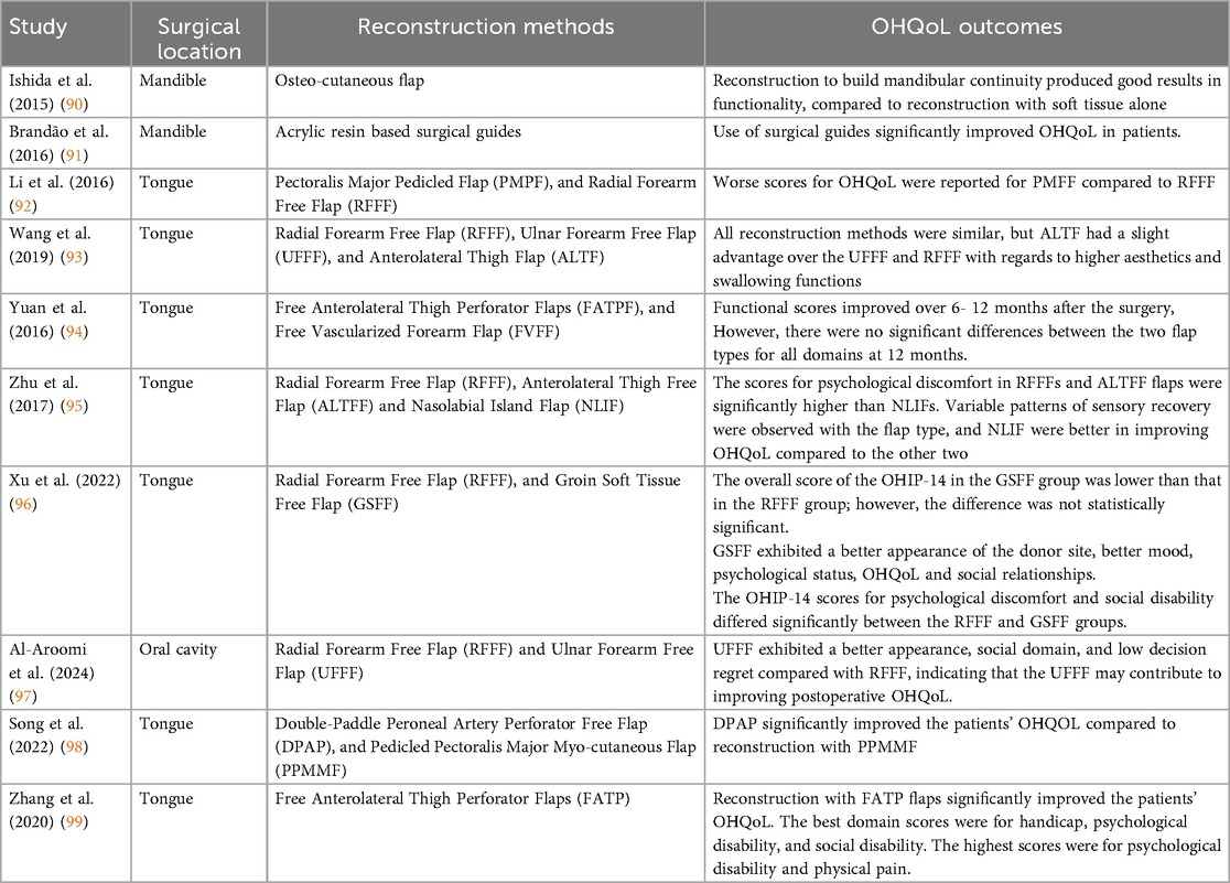 Many studies included in the systematic review assessed OHQoL in HNC patients post treatment. The results are summarised in this section. Reconstruction with flaps and rehabilitation with prosthesis are common clinical sequalae following primary surgical management in HNC patients. Findings from the studies comparing OHQoL outcomes in relation to different reconstruction methods are summarized in Table 2.