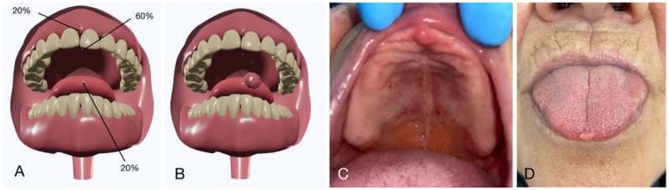 Figure 1. Localisation of intraoral lesions identified during examination. (A,B) 3D models showing lesion sites and frequencies. (C,D) Clinical records illustrating lesions at each location.