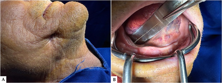 Figure 1. (A) Extraoral clinical presentation prior to surgical intervention: a cutaneous opening is clearly visible on the right mandibular region, consistent with a chronic genian fistula; the overlying skin appears adherent and retracted, suggesting long-standing drainage and possible underlying tract formation. (B) Preoperative intraoral view: intraoral examination reveals the presence of a protruding hair structure arising from the floor of the mouth, indicative of a transcutaneous fistulous pathway, and the surrounding mucosa presents signs of chronic irritation and fibrosis.
