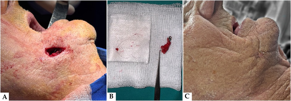 Figure 3. (A) Intraoperative view immediately post-excision: the clinical image taken immediately following surgical excision of the fistulous tract reveals the depth and direction of the lesion, confirming communication between the oral cavity and the skin surface. (B) Macroscopic view of the excised specimen: fistulous tract with hair follicle. The resected tissue includes the complete epithelialized fistulous tract with an embedded hair follicle, confirming the clinical diagnosis and validating the chosen surgical approach. (C) Postoperative outcome: healed extraoral site. Follow-up image illustrating favorable healing of the external skin surface following complete excision of the fistulous tract. No signs of residual infection, drainage, or recurrence were observed at the 14-day postoperative control.