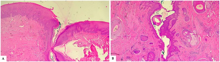 Figure 4. (A) Histological section (H&E stain, 4× magnification) showing the superficial opening of a cystically dilated follicular structure communicating with the epidermal surface. The follicular lining is composed of stratified squamous epithelium, and the surrounding dermis exhibits mild inflammatory changes. (B) Histological section (H&E stain, 4× magnification) showing the distal portion of a cystically dilated follicular structure filled with concentric keratin debris. The cyst wall demonstrates digitiform epithelial projections extending into the surrounding dermis. Numerous skin adnexal structures are visible: a well-formed hair follicle with its sheath (top right), a sebaceous gland (bottom right), and an additional hair follicle (left side). A mild lymphoplasmacytic inflammatory infiltrate is present throughout the periadnexal connective tissue, visible as scattered purple-staining cells.