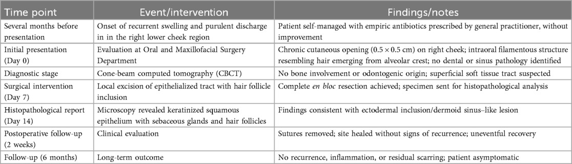 A concise summary of the clinical chronology, diagnostic investigations, and treatment steps is presented in Table 1.