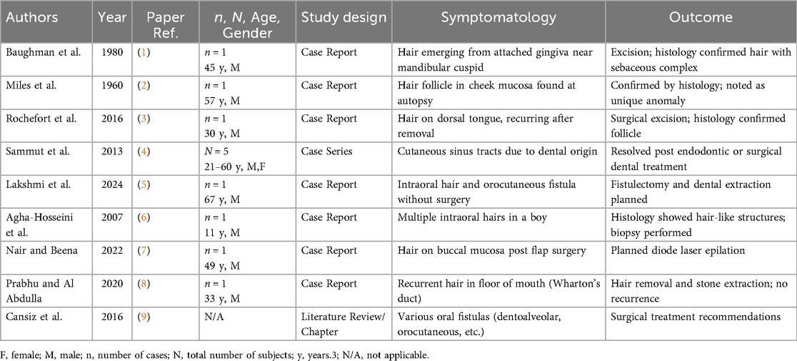 Table 2 summarizes the relevant published case reports and literature on intraoral hair growth and orocutaneous fistulas, with focus on symptomatology and clinical outcomes. A focused literature search was carried out in July 2025 using the following electronic databases: MEDLINE via PubMed, Web of Science, EMBASE, Scopus, ScienceDirect, and Google Scholar. The keyword combination used was as follows: “(oral OR intraoral OR buccal) AND (hair OR hair follicle OR pilose) AND (fistula OR sinus OR orocutaneous) AND (case report OR literature review)”. The review was restricted to articles published in English, with full-text access, from 1960 to 2025. We followed an adapted PICOS framework for inclusion: (P) patients with intraoral or orofacial lesions; (I) clinical ob-servation or surgical excision; (C) differential diagnosis with odontogenic infections; (O) confirmation of ectopic hair or epithelialized tract; and (S) case reports or literature reviews. Exclusion criteria were as follows: (a) reports involving hair transplanted via reconstructive surgery unless clearly documented; (b) studies without histological confirmation of hair follicle; and (c) non-English papers without reliable translation. A total of nine publications met our criteria and are summarized in Table 2. These cases vary in anatomical site, underlying cause (congenital, iatrogenic, or odontogenic), and outcome, with our case representing a rare, spontaneous, non-surgical occurrence of intraoral hair within a chronic genian fistula tract.