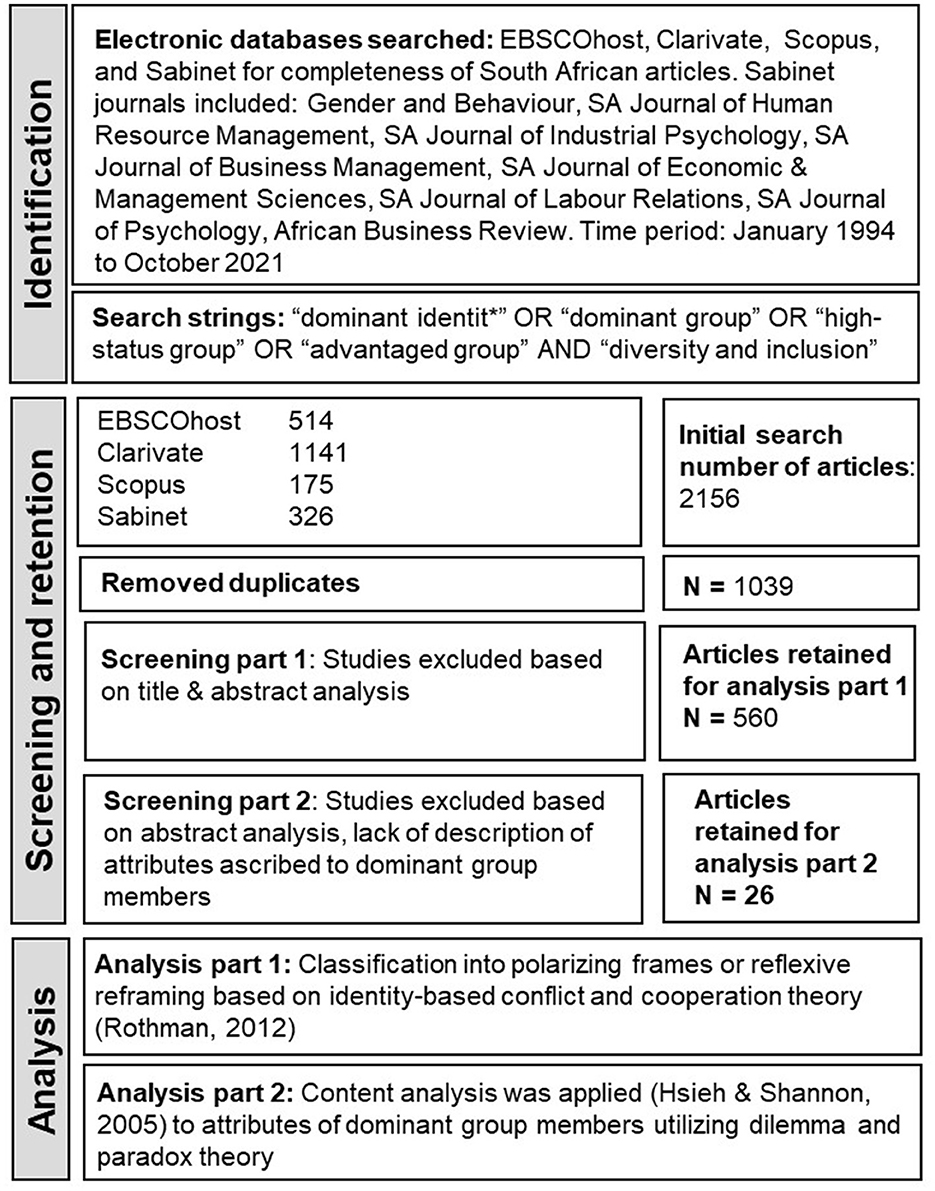 To focus the broad scope of diversity management (Farndale et al., 2015), the search concentrated on studies in humanities and social sciences, as recommended by Marfelt (2016). The year 1994 marked South Africa's transition to democracy (Levy, 2022) and the rise of global diversity-management research and serves as the start for this review (Jonsen et al., 2011). The literature review involved a two-part data analysis process, outlined in Figure 1.