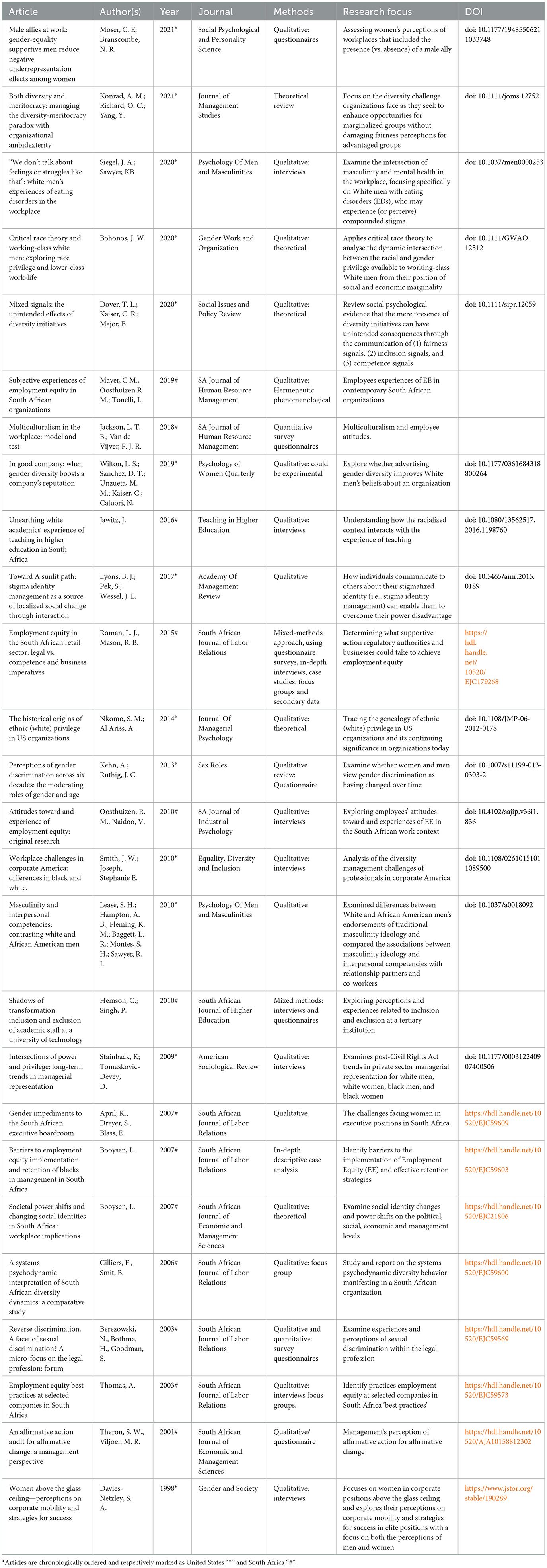 The USA literature emphasized convincing researchers of the importance of group differences, while South African research addressed practical workplace interventions, reflecting an acknowledgment of existing inequities. Across both samples, 541 articles adopted a potentially adversarial frame, while only 19 employed reflexive reframing. Reflexive reframing included critical reflections on diversity management and societal changes, such as in South Africa (Booysen, 2007), and the role of dominant group members in creating inclusive organizations in the USA (Ostrove and Brown, 2018; Moser and Branscombe, 2021). Notably, the interdependence between dominant and non-dominant group members remains under-researched, with a lack of theoretical contributions in both countries.