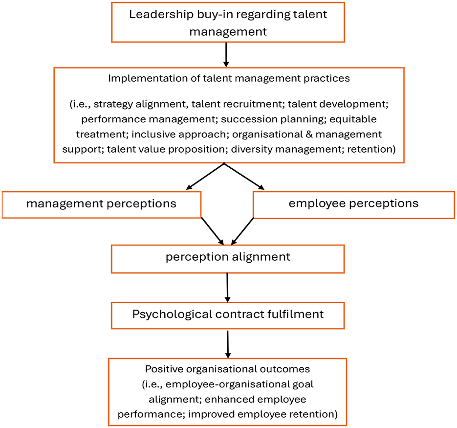 Figure 1 depicts the conceptual framework of this research proposed by the author, highlighting how when management buy-in to the talent management agenda—and in so doing, effectively implement talent management practices—this bridges the gap between employee and management perceptions concerning the imperatives of talent management, consequently resulting in psychological contract fulfillment and positive organizational outcomes.