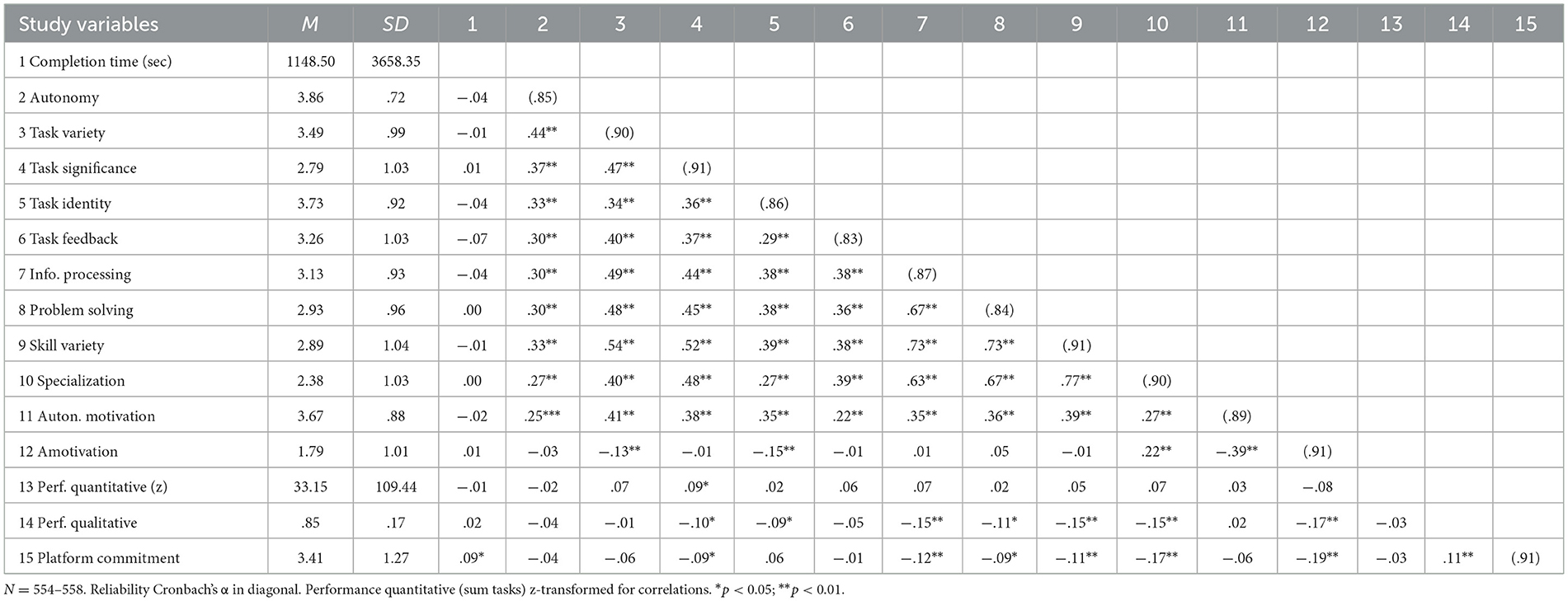 Workers on a German microtasking platform were invited to fill in a quantitative survey in the form of a microtask. In order to enhance variability in performance, the invitation to participate was sent to 800 workers with either high or low quantity and quality of prior performance. The sample of 564 participating workers marks an initial response rate of 70.5% (N = 564). The sample included persons with high quality (i.e., task approval rate above 80%) and either high (n = 149) or low (n = 149) quantity (i.e., more, respectively less, than 250 realized tasks), and persons with lower quality and either high (n = 118) or low (n = 148) quantity. Data was complete for 558 questionnaires. One-third (33.5%) of the participants were women (n = 187), 56.8% men (n = 317), and 54 did not specify. The highest education was indicated as university for 137 participants (24.6%), secondary school for 72 participants (12.9%), high school for 185 participants (33.2%), and apprenticeship for 74 (13.3%), while 90 participants did not indicate their level of education. A total of 80 participants held a Bachelors' degree (14.3%), and 22 held a Masters' degree (3.9%). The majority (76.0%) of the participants are of German origin (n = 424), followed by 38 Austrians (6.8%), six Swiss, and each of one to three participants from 16 other countries. For 69.7% of participants, the country of residence was Germany (n = 389). Regarding their employment status, 33.9% of participants were employed (n = 189), 23.8% were students (n = 133), 8.1% were pupils (n = 45), 5.2% were freelancers (n = 29), 3.2% were entrepreneurs (n = 18), 2.7% were stay at home parents (n = 15), 2.3% were unemployed (n = 13), and one indicated that they were an intern (115 not specified).