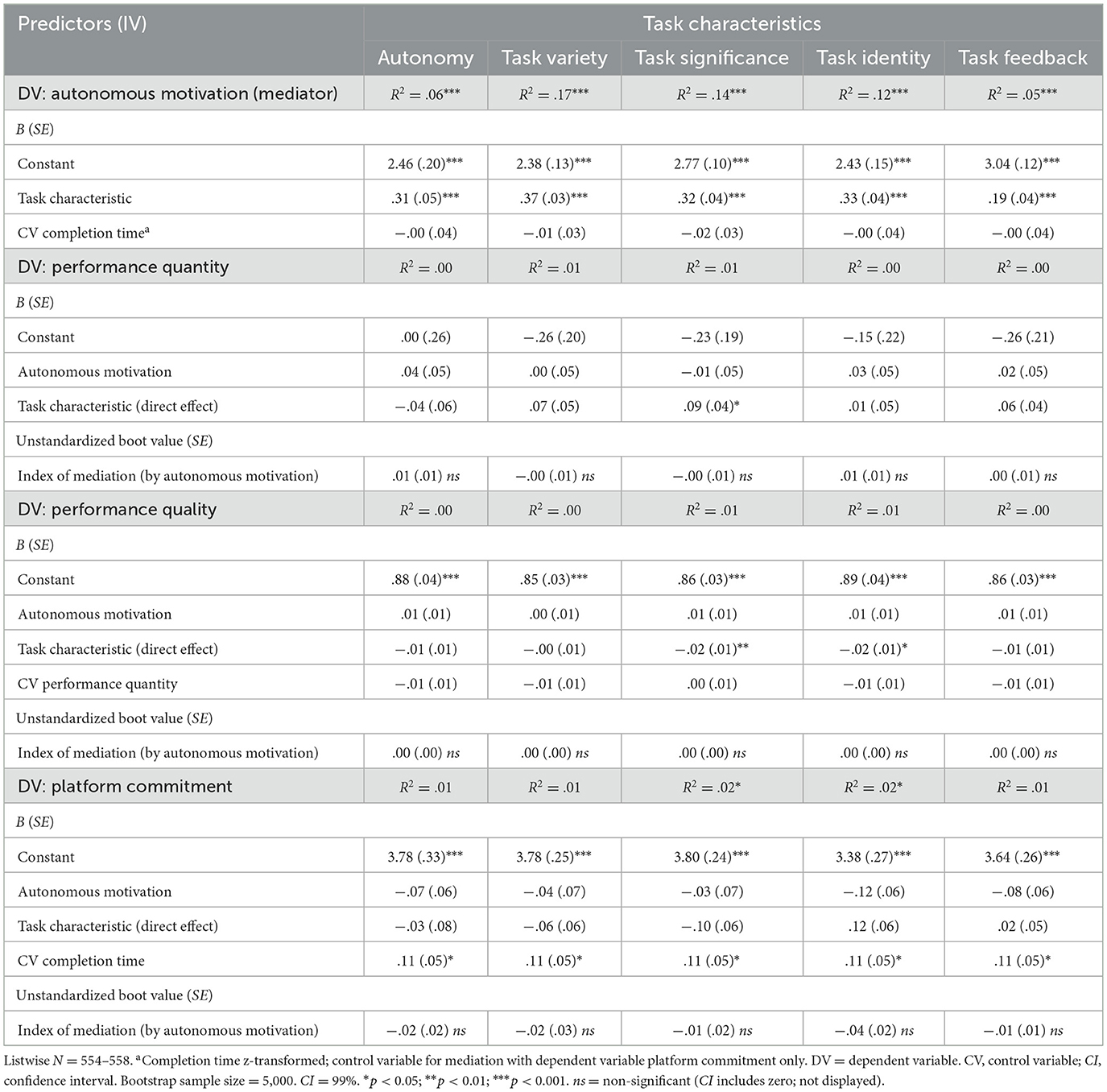 Though all task characteristics were significantly positively related to autonomous motivation, the latter was not related to any of the dependent variables (Table 2). Hence, the mediation hypothesis H1 for the relationships between task characteristics and (a) quantitative performance, qualitative performance and (b) platform commitment was not supported. Additionally, none of the direct relationships between task characteristics and performance or platform commitment reached p < .001.