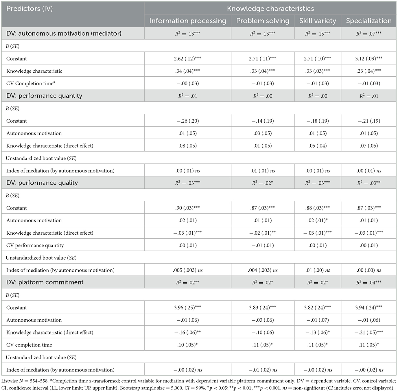 Likewise, all knowledge characteristics were significantly positively related to autonomous motivation, but the mediation hypothesis H2 for the relationship between knowledge characteristics and (a) quantitative performance, qualitative performance and (b) platform commitment was not supported (Table 3). Regarding the direct effects of knowledge characteristics, none was significantly related to performance quantity, while all but problem solving were significantly (i.e., p < .001) negatively related to performance quality (i.e., information processing, skill variety, specialization all B = −0.03, SE = .01, p < .001), and specialization was also significantly negatively related to platform commitment (B = −0.21, SE = .05, p < .001).