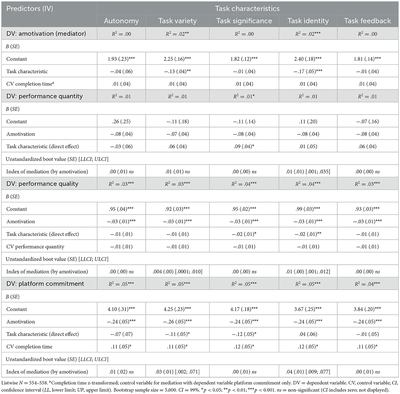 While only task identity (B = −0.17, SE = .05, p < .001) was significantly negatively related to amotivation (Table 4), amotivation in turn was not significantly related to performance quantity, but was negatively related to performance quality (B = −0.03, SE = .01, p < .001) and platform commitment (B = −0.24, SE = .05, p < .001). Amotivation mediated the associations of task identity with performance quantity (CI [.001; .035]), of task variety and task identity with performance quality (CI [.0001; .010], resp. [.001; .012]), and with platform commitment (CI [.002; .071], resp. [.009; .077]). Thus, the mediation hypothesis H3 for the relationships between task characteristics and (a) quantitative performance, qualitative performance and (b) platform commitment was partially supported for task variety and task identity.