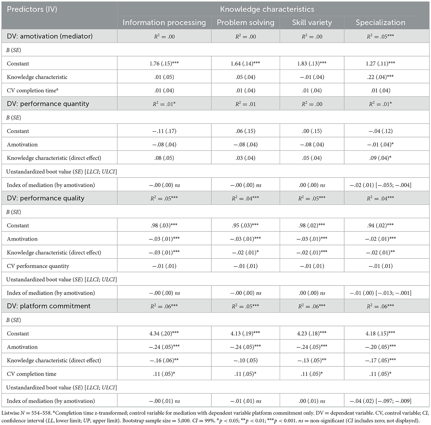 While specialization was positively related to amotivation (B = 0.22, SE = .04, p < .001), the mediation hypothesis H4 for the relationship between knowledge characteristics and (a) quantitative performance, qualitative performance and (b) platform commitment was only supported for this one knowledge characteristic (see Table 5). The association of specialization with quantitative performance (CI [−.055; −.004]), qualitative performance (CI [−.013; −.001]) and platform commitment (CI [−.097; −.009]) showed significant indirect effects via amotivation.
