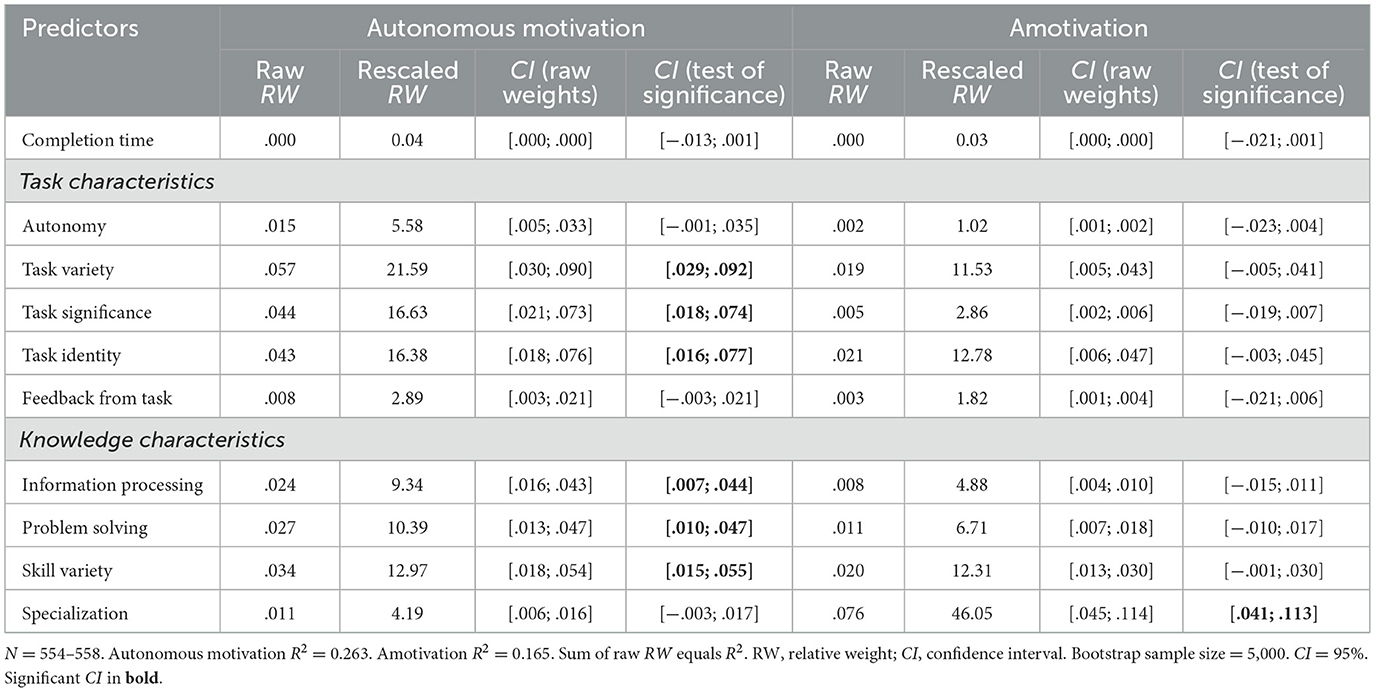 Table 6. Relative weight analysis of relationships between task and knowledge characteristics and autonomous motivation/amotivation.