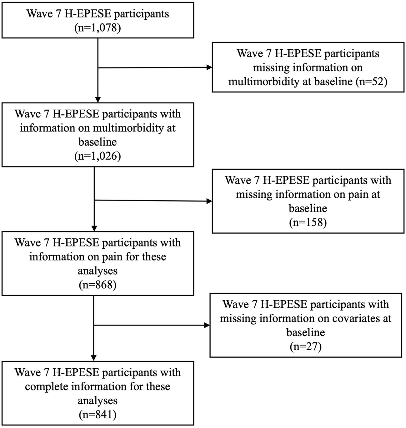 Wave 7 was used as the baseline for these analyses, where participants were aged 80 and older (Figure 1). Of the 1,078 participants interviewed at baseline, we excluded participants who had missing information on health conditions included in our multimorbidity variable (n = 52), those with missing information on pain at baseline (n = 158), and those with missing information on covariates (n = 27). Our final analytical sample was 841. Those excluded from our analysis had fewer years of education on average, lower Mini-Mental State Examination Score (MMSE) scores, and more often reported high depressive symptoms, pain on weight-bearing, and pain that limited their daily activities (Supplementary Table 1). Although the H-EPESE allows for direct or proxy interviews, information on pain and the MMSE were obtained by direct interviews with the participant. Therefore, our final analytic sample did not include proxy interviews.