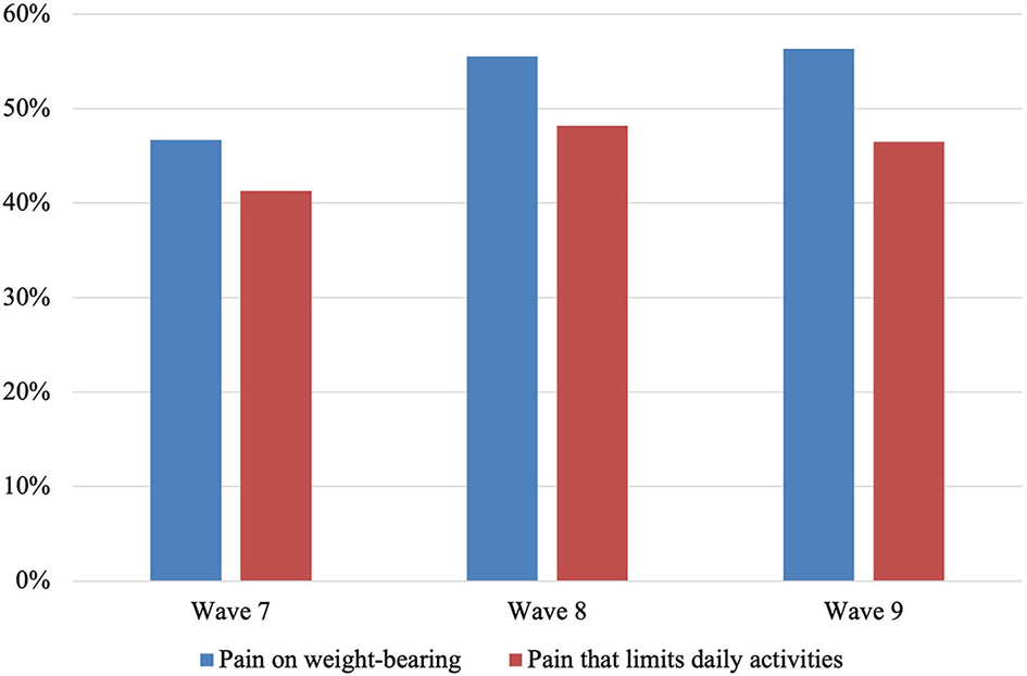 Figure 2 displays the percentage of participants reporting pain on weight-bearing and pain that limits daily activities (a lot or somewhat) at each wave. At Wave 7 (baseline), 46.7% of participants reported pain on weight-bearing; this increased to 55.5% at Wave 8 and 56.3% at Wave 9. At Wave 7, 41.3% of participants reported pain that limited their activities a lot or somewhat, which increased to 48.2% at Wave 8, then slightly decreased to 46.5% at Wave 9.