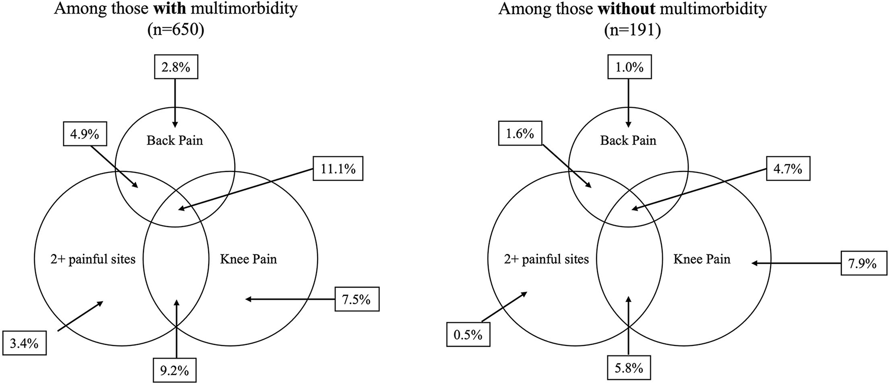 Participants with multimorbidity more often reported pain on weight-bearing (p < 0.05) (Table 2). The most commonly reported pain locations were knees, legs, and ankles/feet for those both with and without multimorbidity; however, those with multimorbidity more frequently reported each pain location. The median number of pain locations was 0.0 for both those with and without multimorbidity; however, those with multimorbidity had a wider interquartile range (0.0-2.0) compared to those without multimorbidity (0.0-1.0) (p < 0.05). Among those with multimorbidity, 28.6% reported pain at two or more locations, compared to 12.6% of those without multimorbidity (p < 0.05). Those with multimorbidity more frequently reported pain that limited their daily activities a lot (19.8% vs. 6.8%) or somewhat (25.7% vs. 19.9%) (p < 0.05). Among those reporting pain, there was no difference in pain lasting longer than 4 weeks, pain interfering with sleep, reporting doctor visits for pain, or taking medication for pain, based on multimorbidity status. Overall, most participants reported pain lasting longer than 4 weeks (83.0%), seeing a doctor for pain (89.3%), and taking medication for pain (79.1%). Figure 3 displays the overlapping pain locations by multimorbidity status. Among those with multimorbidity, 11.1% reported pain at two or more sites, including back and knee pain, compared to 4.7% of those without multimorbidity. Additionally, 9.2% of participants with multimorbidity reported pain at two or more sites, including knee pain but not back pain, compared to 5.8% of those without multimorbidity.